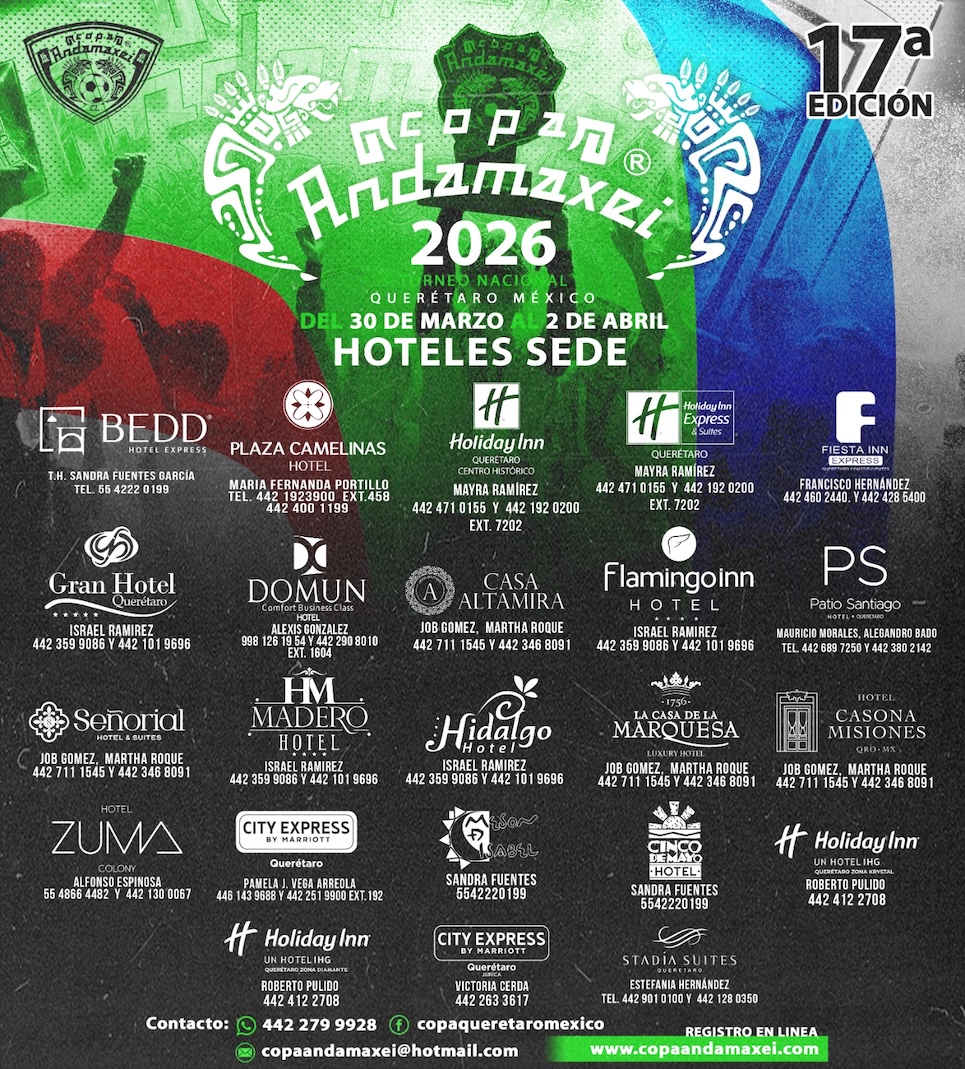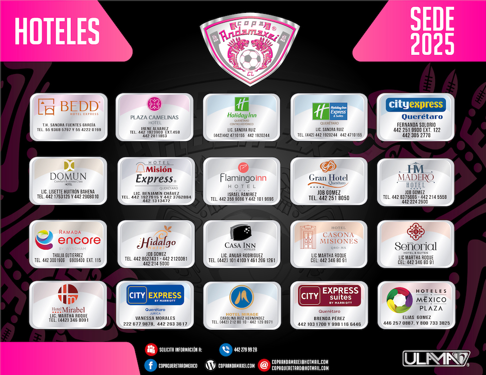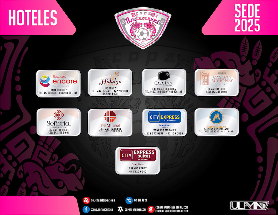 Elije la opción de hotel que más te agrade y comunícate directamente mencionando que serás participante de Copa Andamaxei para obtener tarifas preferenciales.